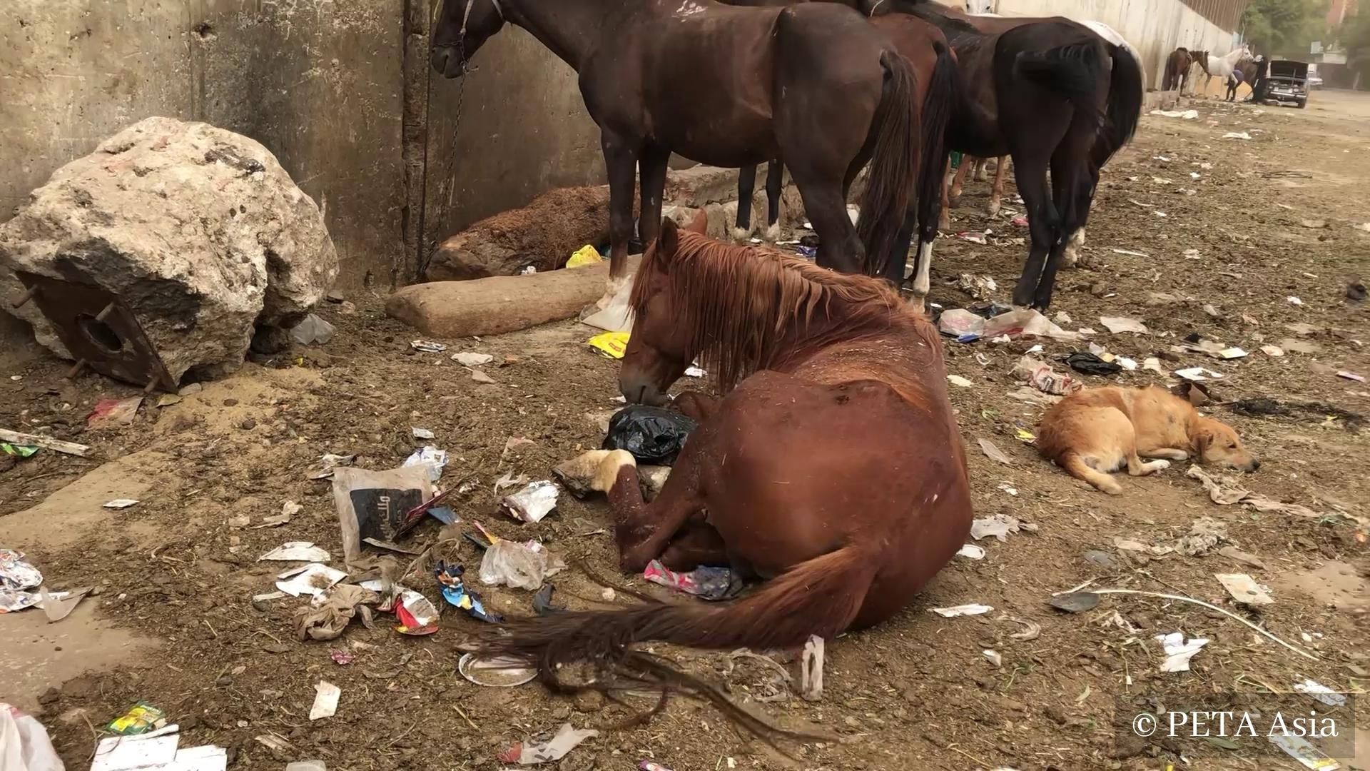 PETA Asia investigations at Egypt’s top tourist sites have documented the appalling abuse of animals. Camels and horses used for tourist rides at popular sites in Egypt are being beaten with batons, hit in the testicles, and denied rest, while dead animals are dumped like rubbish. Despite its promises, the Egyptian government has done nothing to stop the abuse of animals at these sites. Nothing has changed since footage was released in 2022, showing wounded, exhausted horses eating rubbish to survive.